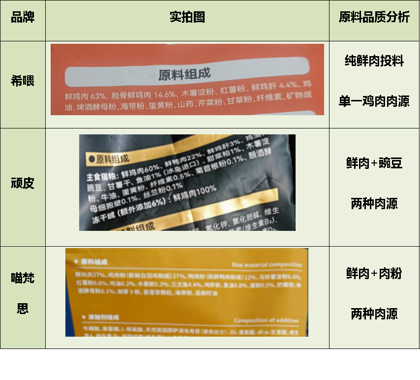 实测对比三款性价比高的猫粮.猫咪是纯肉食动物,肠胃只能高效吸收动物蛋白,所以猫粮最好选肉做的,且肉原料也有优先级划分:鲜肉>冻肉≫肉粉。鲜肉指的是活禽宰杀后直接投料,不会对原料做任何的加工处理,所以能保留最多的天然营养,做出来的猫粮口感也最好;而肉粉原料通常是屠宰副产品(皮毛、碎骨、内脏)深度加工而成的,营养破坏比较严重,做出来的猫粮营养也远不如鲜肉猫粮,所以一般不被推荐。另外,还要避开谷物猫粮,像玉米、小麦、大豆这些谷物原料提供的植物蛋白,猫咪几乎无法吸收,吃多了还会刺激肠胃,引发猫咪便秘。