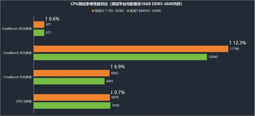 在CPU的理论性能层面,和同样是65W功耗释放的锐龙7 8845HS(规格与锐龙7 H260相同)进行横向对比,单核性能提升幅度在11.3%~17.4%之间,平均增幅超过了13%。