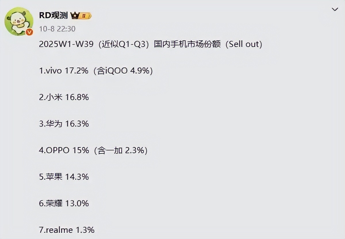 因为如果不是iPhone17在后半程顶着,今年苹果在前三个季度的表现可是相当拉垮的,几乎都快跌出前五了,根据RD观测发布的数据,在2025年W1-W39,苹果的份额已经排在了第五位,岌岌可危啊。