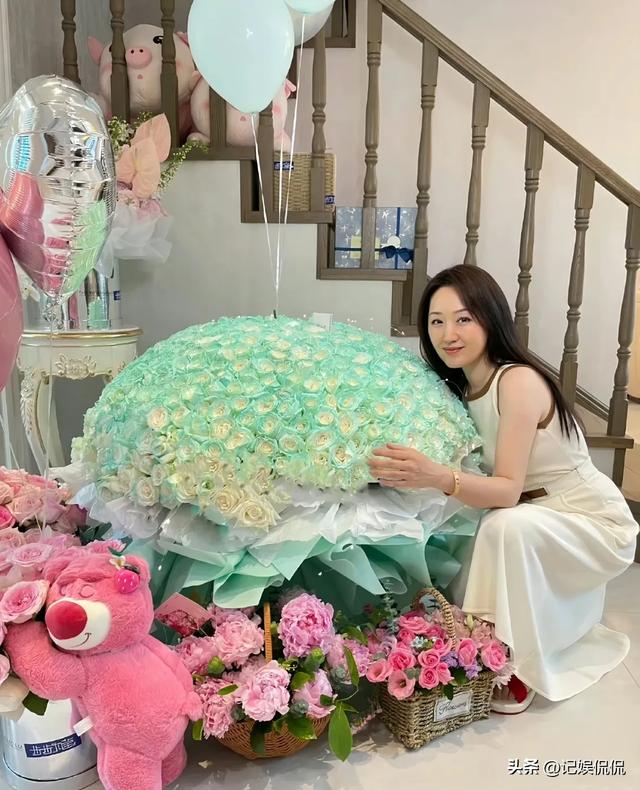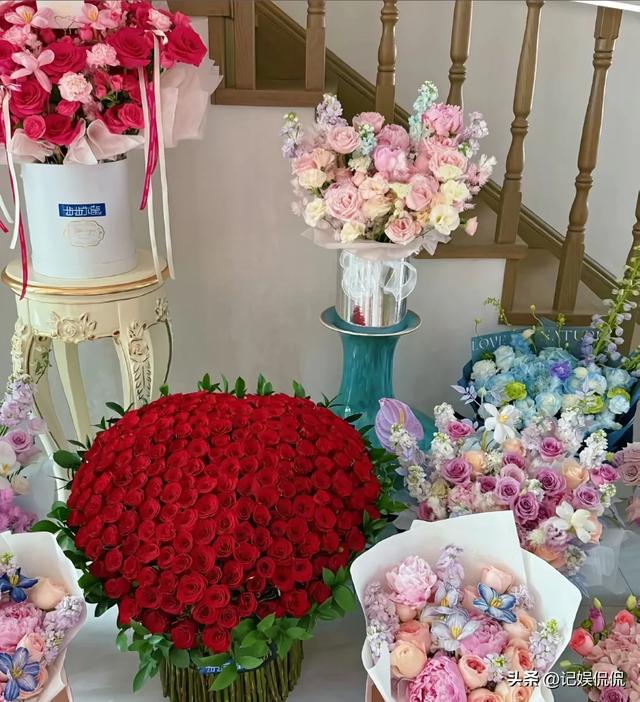 别墅的地上摆满了大束玫瑰,有99朵的,还有999朵的,杨钰莹特意蹲下与鲜花合影,颇有点儿浪漫满屋的意思了。