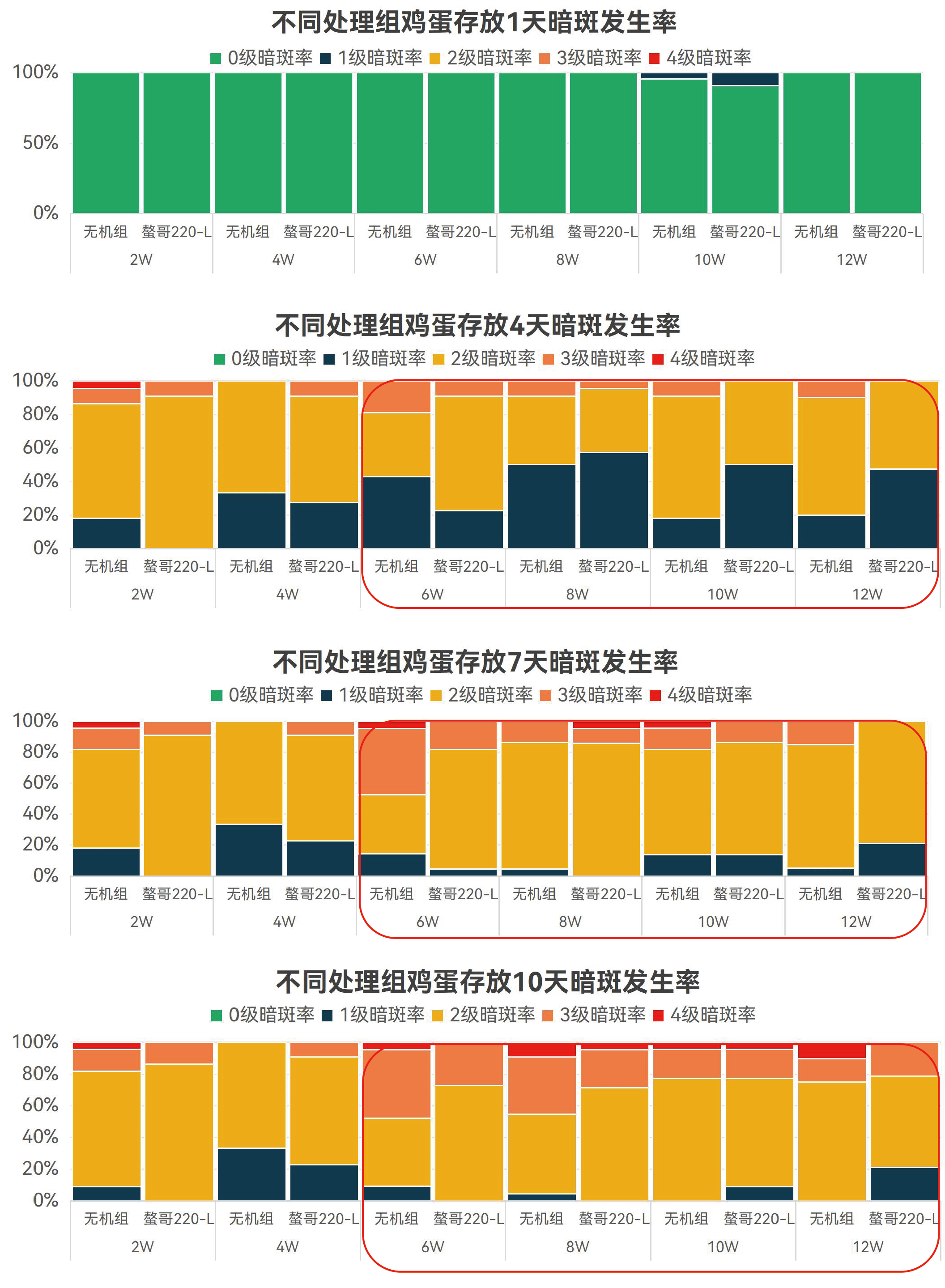 一般来说,暗斑评级≥2则说明暗斑发生,从2-4级暗斑发生率下降比例可以看出,螯哥220-L能够有效降低鸡蛋存放8天内暗斑发生率。