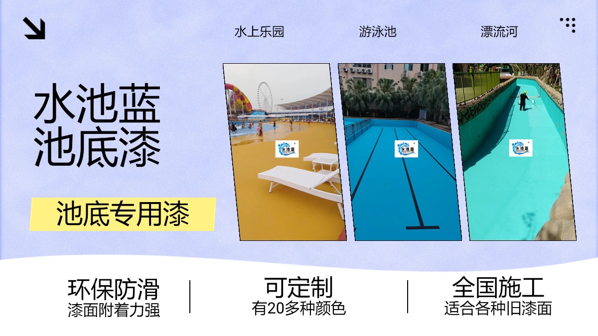 针对这些痛点,水池蓝池底漆提供了专业解决方案。这款产品采用采用不饱和羧酸材料,实现极致防滑效果。别急,它的耐磨指数达到国家标准2倍以上,持续浸泡360天无异常。大面积施工时,抗黄变性能尤其突出,确保造浪池、漂流河、温泉区等场景持久如新。