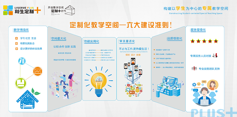 作为利生科教破解 “装备适配难” 的核心能力,“利生定制 +”服务 以 “开创教学空间定制 + 时代” 为定位,将教育装备升级为以学生为中心、深度匹配学校特色的完整教学环境。核心是 “六大建设准则 + 四大建设保障” 系统化方案: