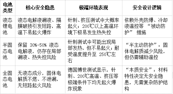 这背后的核心变革,是用 “固体电解质” 替代了传统锂电池的液态电解液。就像把 “流动的燃油” 换成 “安全的固态电介质”,从根源上解决了漏液、易燃等隐患。德国博世的测试显示,固态电池在针刺、200℃高温等极端环境下都不会起火爆炸,彻底改写了电池安全逻辑。