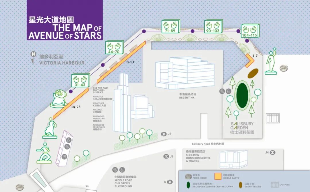 最后再来看一个香港的案例。香港维多利亚港畔拥有仿照好莱坞星光大道设计的地标性设施——香港星光大道,该大道位于尖沙咀海滨长廊,全长440米,以电影人掌印、铜像为核心元素,维港栏杆上镶嵌近百位港星手印砖,游客可与偶像手印重合,感受时空连接,大道沿途还图文并茂展示香港电影从萌芽到繁荣的历程,曾是游客到访量最高的景点,但随着设施破损老化,缺乏休息区、零售档位过多、旅游团拥挤等问题的出现,2015年星光大道正式关闭启动改造,直至2019年重新开放。