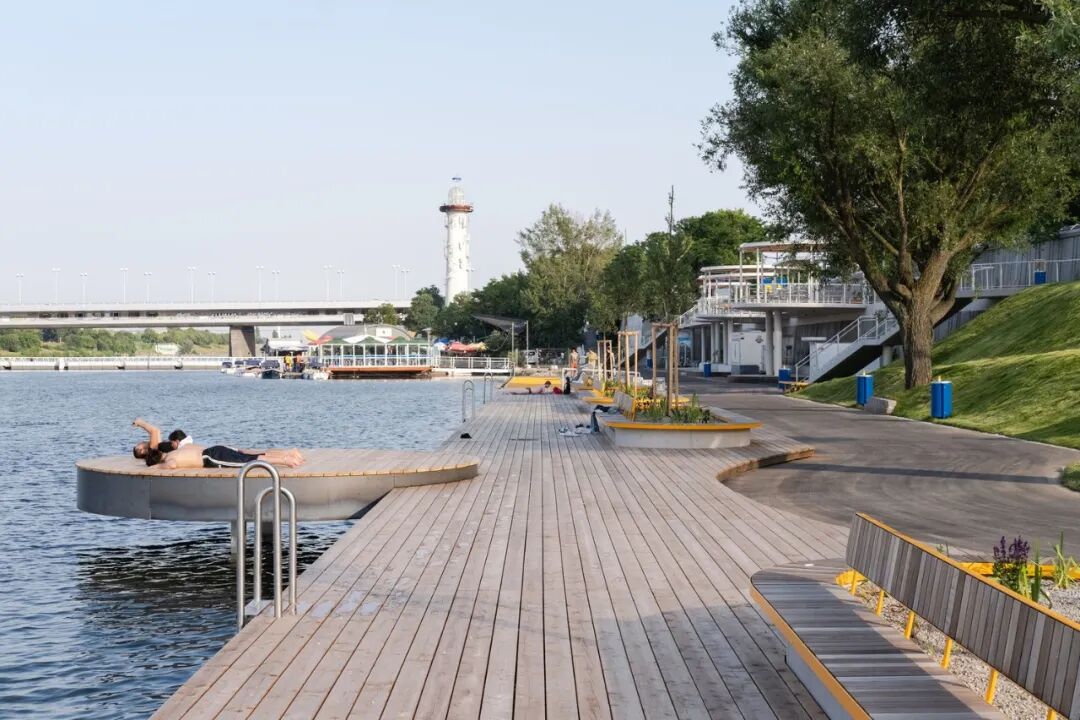 维也纳多瑙岛22号码头项目将原本单一的防洪功能岛打造成兼具普惠性和包容性的公共滨水生活岛。以“让公共空间从‘城市背景板’转变为服务每个人的‘共享舞台’”为核心理念,保留滨水地带的生态底色,又植入休闲、办公、社交等功能。项目分为三大区域:最贴近多瑙河的区域,被打造为滨水步道区,通过阶梯式座椅连接儿童嬉戏的浅水区,搭建大型木平台供市民休憩;针对数字游民与灵活办公需求,在高台区设置弧形阳台式工作区,配备桌椅与办公平台,提供免费WiFi、木条遮阳凉亭及夜间照明,营造出宁静高效的户外办公氛围;预留文化亭区域,用于书刊、杂志等文化供给,未来还将增设遮阳野餐花园、带阳光露台的咖啡馆和多功能健身区。
