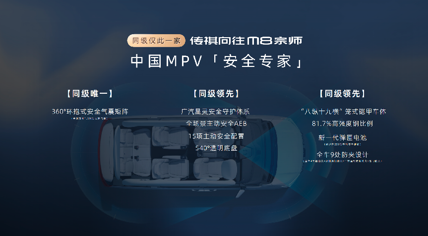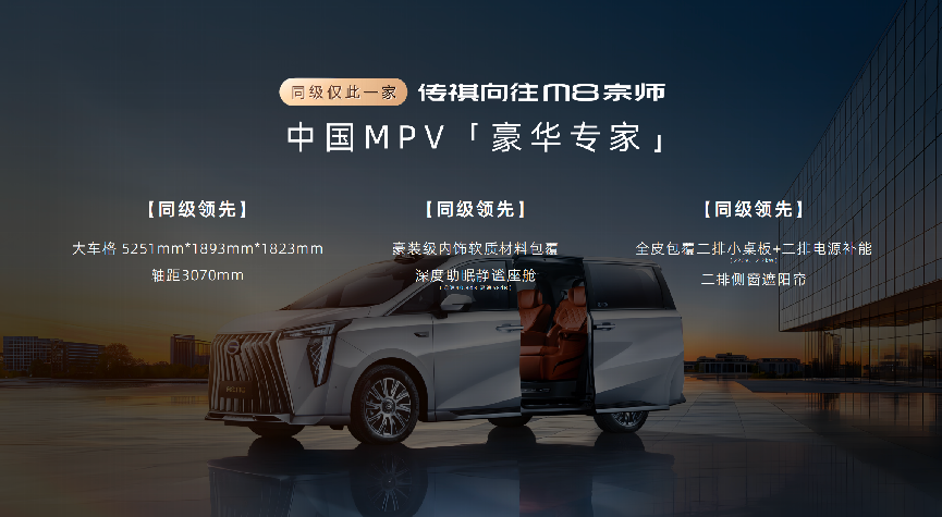 传祺向往 M8 宗师以 “五大专家” 定位,覆盖舒适、智能、动力、豪华、安全全维度,重新定义 25 万级豪华 MPV 标准。