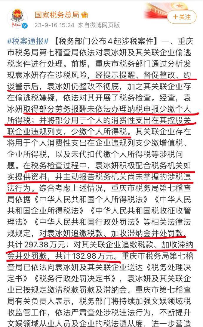 谁知道在9月16日,国家税务总局正式对袁冰妍进行了通报,对她本人和相关公司罚款297万。