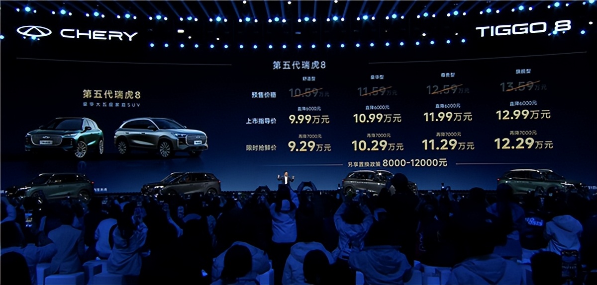 据了解,全新第五代奇瑞瑞虎8于11月10日晚间上市,共推出4款车型,售价9.99-12.99万起,限时抢鲜价9.29-12.29万元。