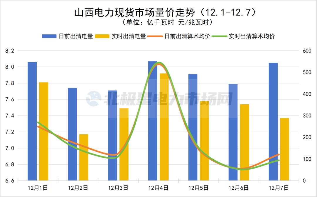 山西:12月1日至12月7日日前出清算术均价最高为537.09元/兆瓦时,最低为55.13元/兆瓦时;实时出清算术均价最高为544.79元/兆瓦时,最低为52.56元/兆瓦时。