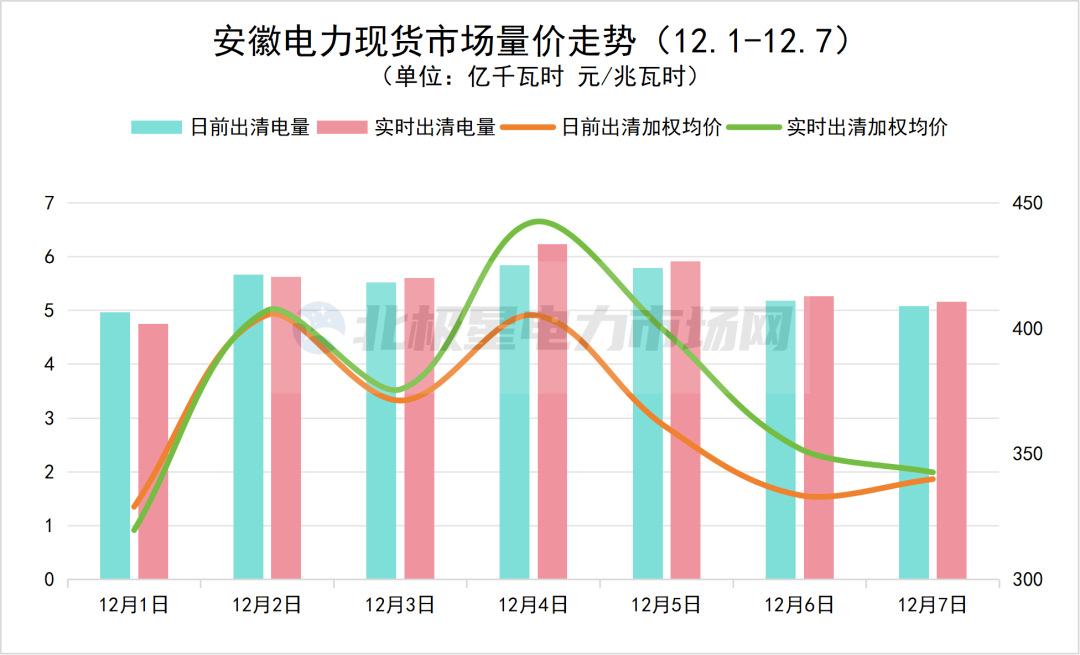 安徽:12月1日至12月7日日前出清加权均价最高为405.38元/兆瓦时,最低为329.01元/兆瓦时。实时出清加权均价最高为442.36元/兆瓦时,最低为319.7元/兆瓦时。