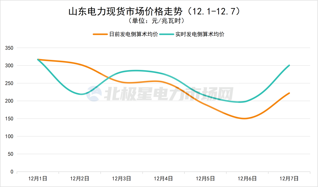 山东:12月1日至12月7日日前发电侧算术均价最高为317.19元/兆瓦时,最低150.67元/兆瓦时;实时发电侧算术均价最高316.92元/兆瓦时,最低199.92元/兆瓦时。