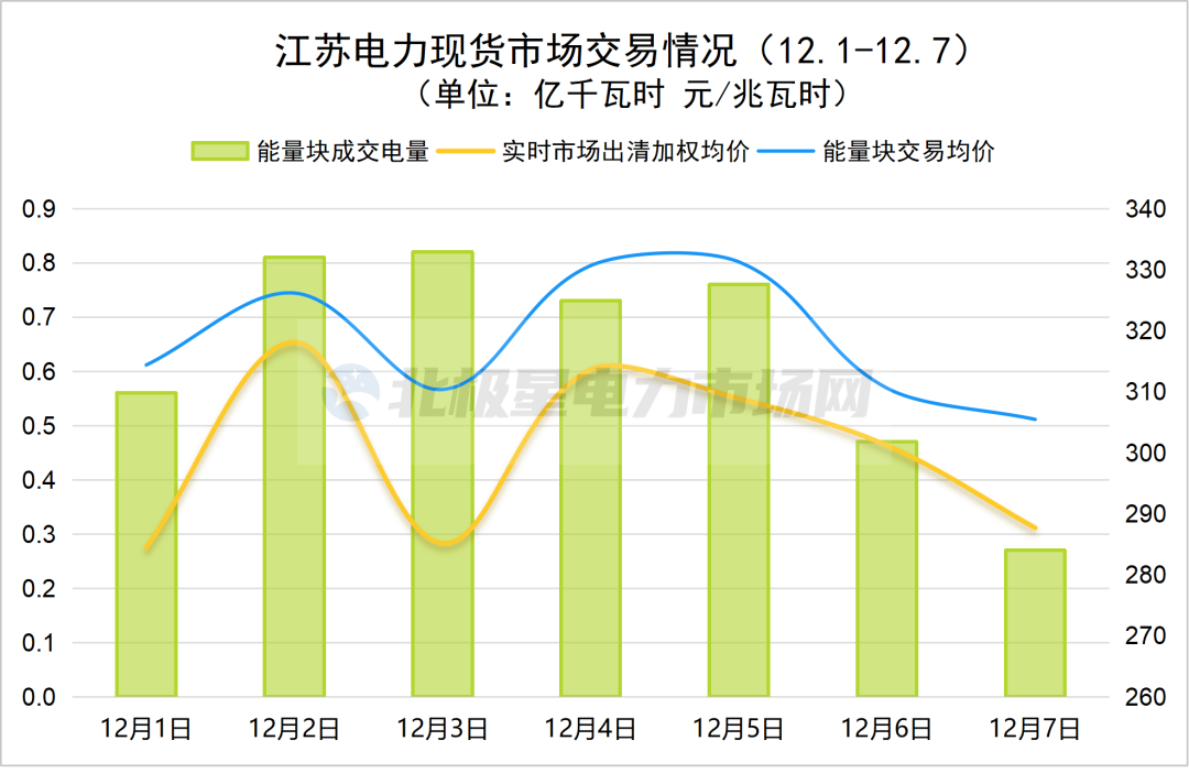 江苏:12月1日至12月7日实时市场出清加权均价最高为318.09元/兆瓦时,最低为284.46元/兆瓦时。能量块交易均价最高为331.26元/兆瓦时,最低为305.46元/兆瓦时。