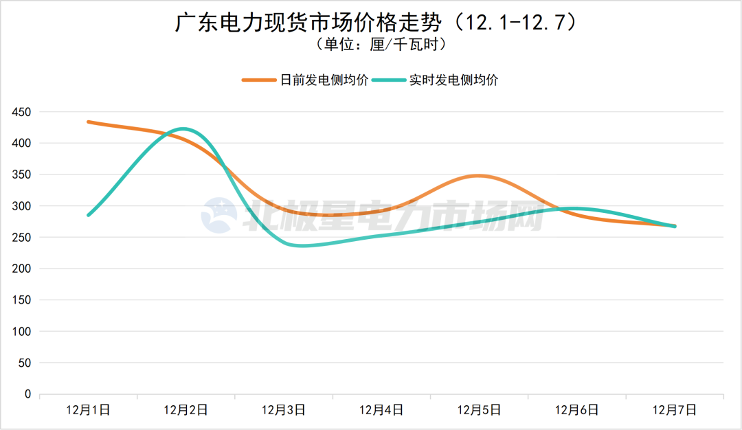 广东:12月1日至12月7日日前发电侧均价最高为434.01厘/千瓦时,最低为268.07厘/千瓦时;实时发电侧均价最高为422.52厘/千瓦时,最低为241.77厘/千瓦时。