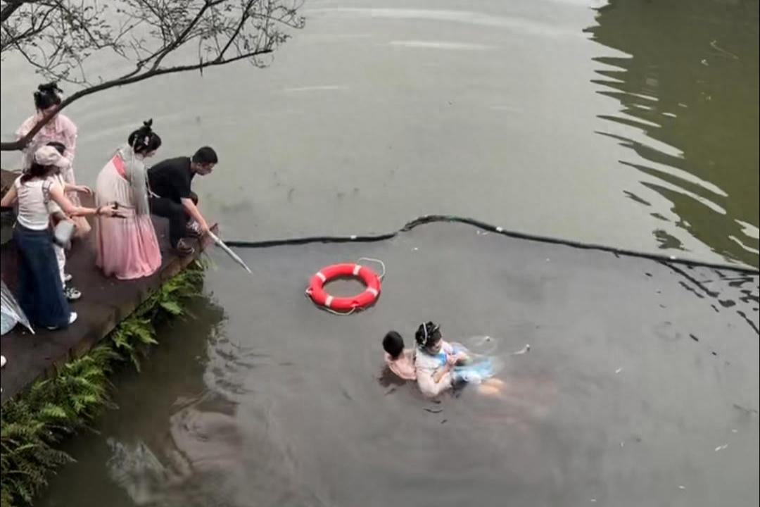现场两段视频还原了营救过程:女子落水后因不会游泳不停挣扎,很快出现下沉迹象。岸上游客见状纷纷伸出援手,有人试图用雨伞递向水中,有人迅速从桥上扔下救生圈。危急时刻,一名青年男子将手机托付他人后,来不及脱衣便跳入池中救人。几乎同时,景区工作人员赶到现场,用救生杆合力将落水者与施救者拉至岸边,两人均成功脱险。