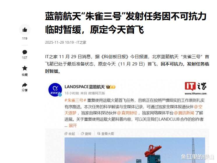 原本被视为中国商业航天里程碑时刻的“朱雀三号”首飞,在最临门一脚突然按下了暂停键。官方的解释是“因不可抗力,任务临时暂缓”。一句寥寥的公告,却让很多网友失望至极。毕竟,这是一枚被寄予厚望、与美国猎鹰9号同级对标、肩负推动中国商业航天进入“可重复使用时代”的重量级火箭,它的每一步都备受关注。