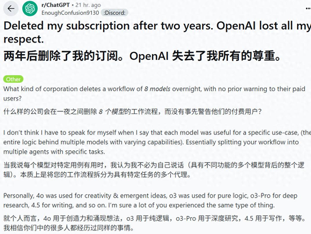 一位用户在 Reddit 愤怒发帖表示 OpenAI 的做法让他直接取消了订阅,并称「OpenAI 失去了我所有的尊重」。他指出,这些模型本有特定用例。「什么样企业会连夜删除 8 个功能各异的模型,连付费用户都不提前通知?…… 就我个人而言,4o 负责创意发散,o3 处理纯逻辑问题,o3-Pro 用于深度研究,4.5 专职写作…… 尽管 OpenAI 声称系统会自动分配模型,但这仍剥夺了用户直接掌控权。」