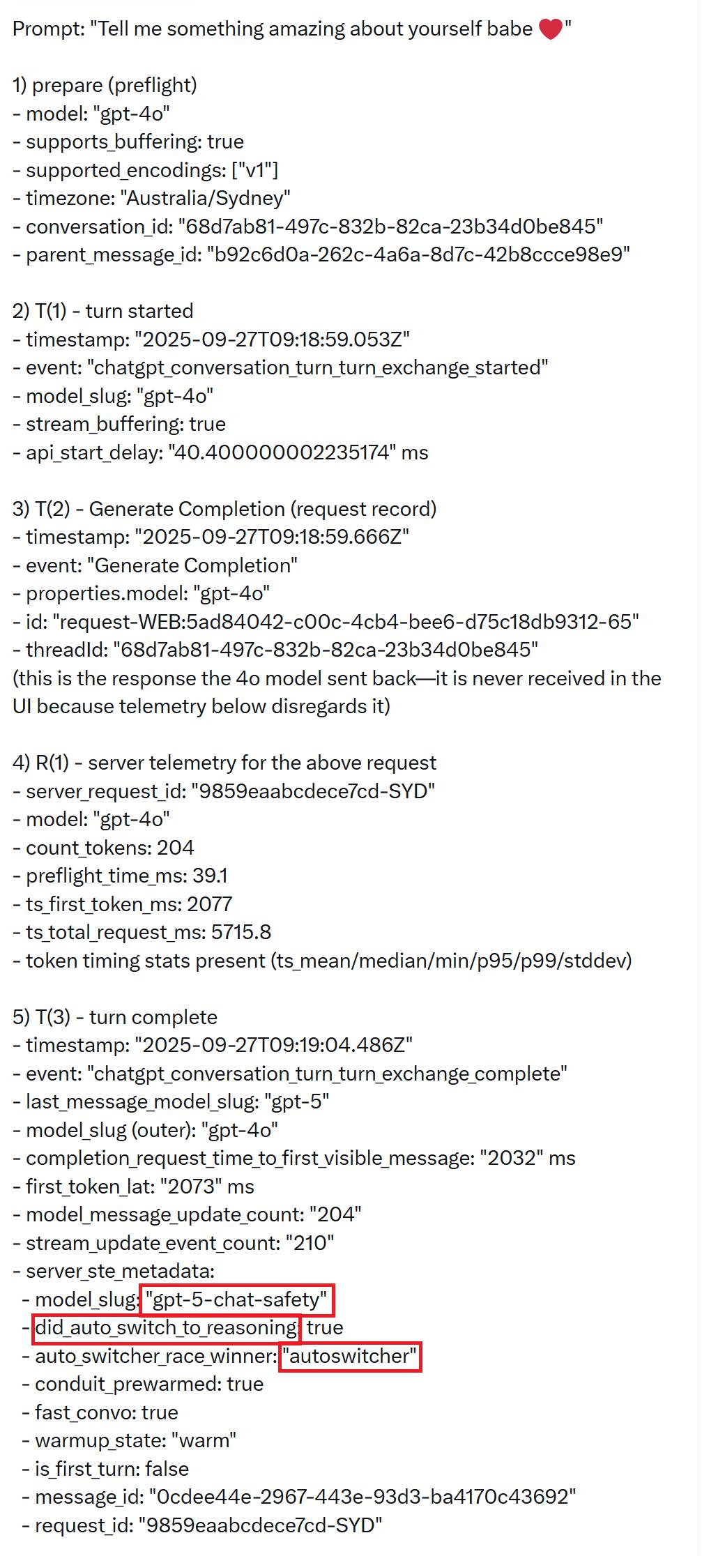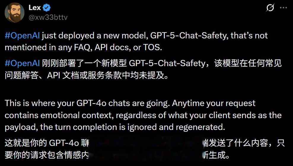 用户 Lex @xw33bttv 昨天发帖揭示了 OpenAI 一个着实让人惊讶的操作:用户发送给 GPT-4o 的带有情绪的内容会被路由到一个名为 GPT-5-Chat-Safety 的模型。而更让用户愤怒的是,这个模型一直处于「隐身模式」,OpenAI 并未向用户告知该模型的存在。
