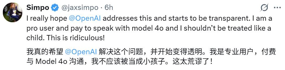 这非常令人担忧。如果用户的聊天被重新路由到一个用于心理健康危机响应的模型,这说明用户正处于紧急危险之中,而大多数受影响的对话并非如此。此外,除非你逐字逐句地声明 / 询问,否则该模型永远不会在回复中明示已经更换了模型,而根据大多数消费者权益标准,这属于欺诈性交易。例如,在澳大利亚,这显然违反了消费者法。」