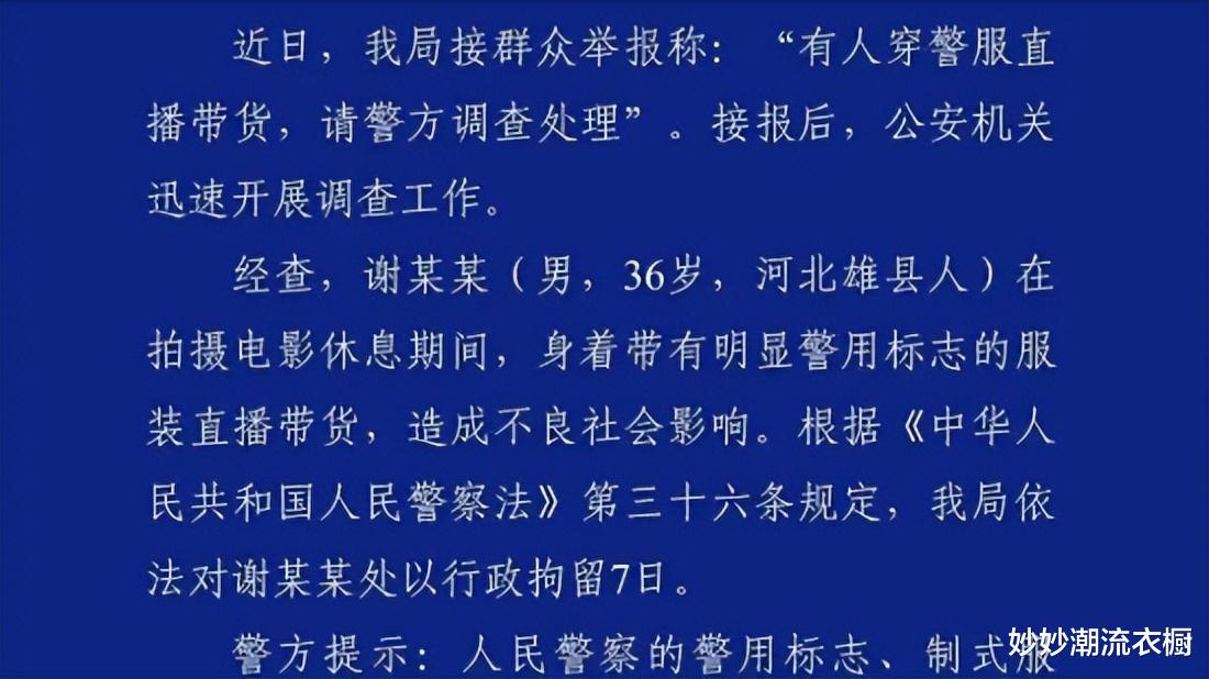 嘎子身着疑似警察的服装在直播间卖电子产品,被依法行政拘留。