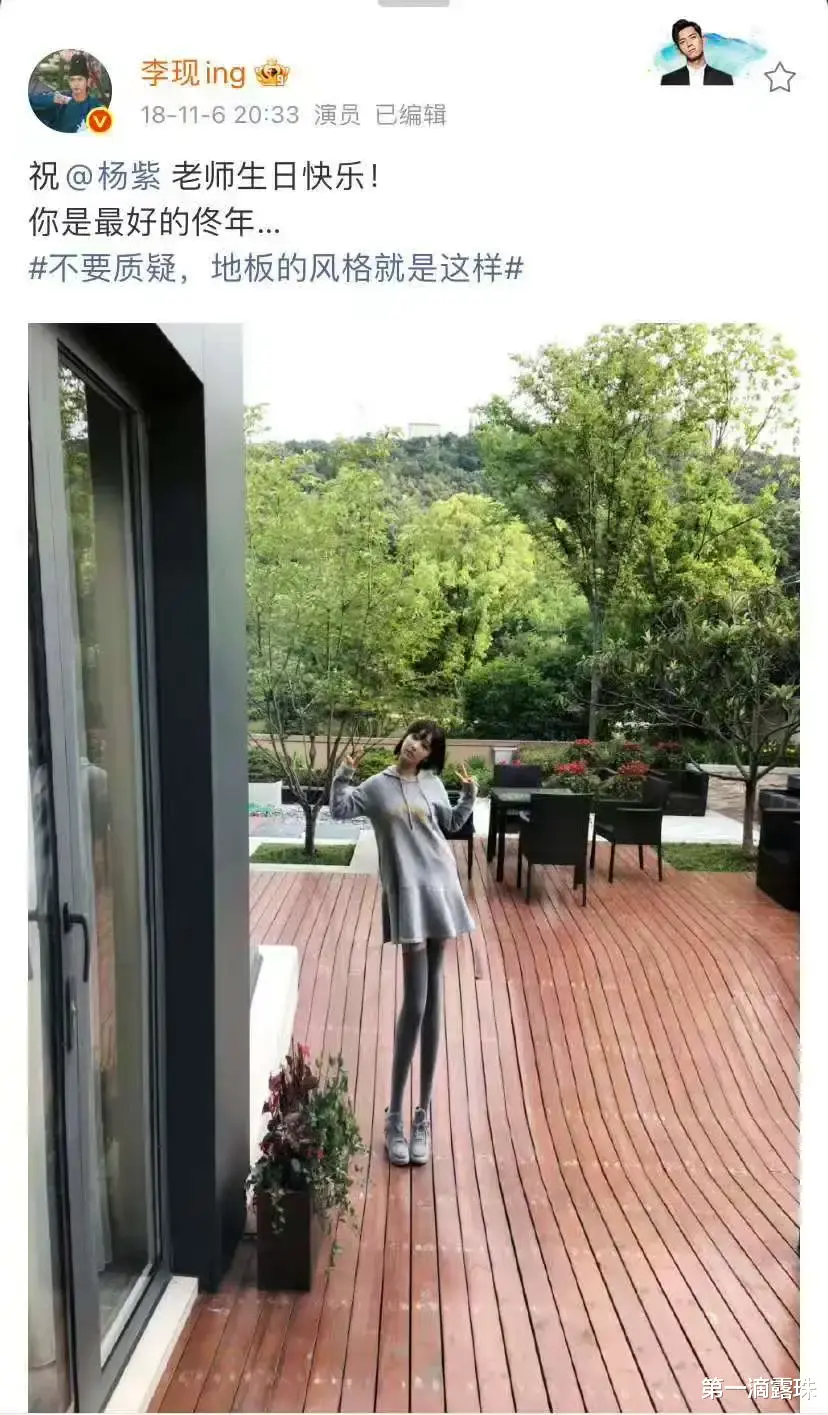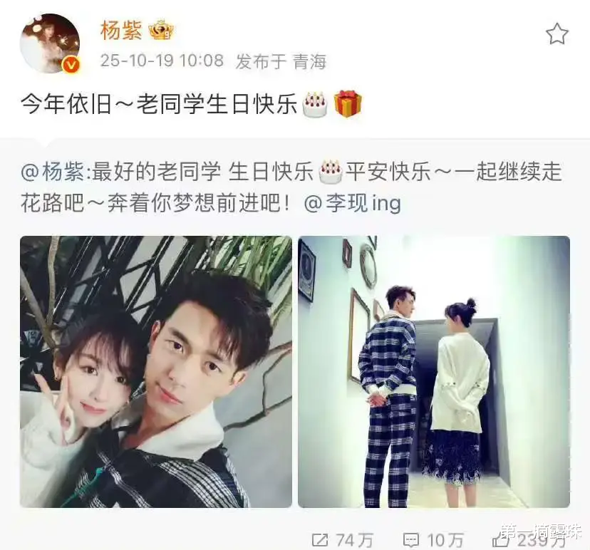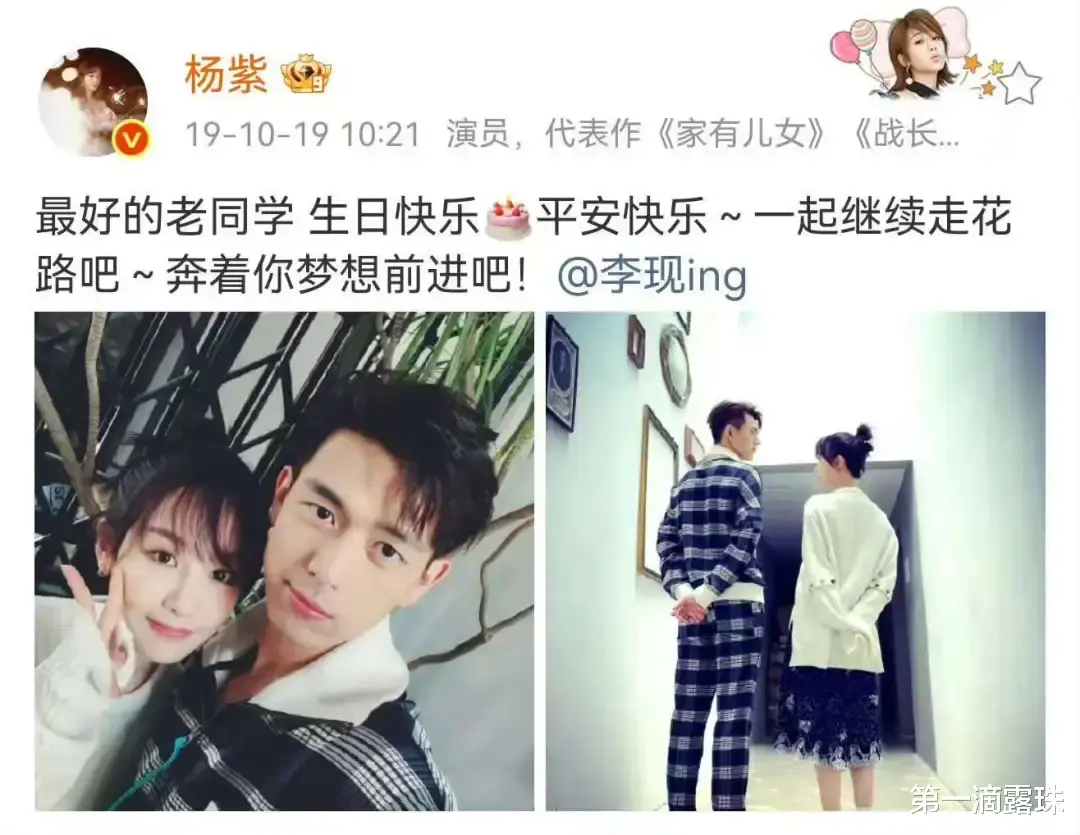10月19日,演员杨紫在个人社交平台发博,为演员李现庆祝生日:今年依旧~老同学生日快乐!