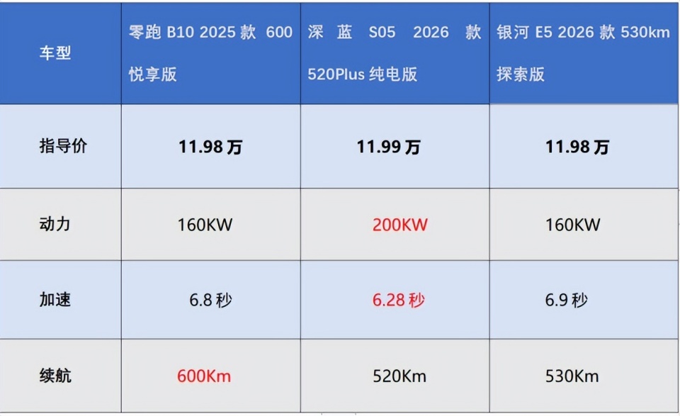 当然为了公平起见,我们选择的是三款价格接近的版本,分别为零跑B10 2025款 600悦享版(指导价11.98万)、深蓝S05 2026款 520Plus纯电版(指导价11.99万)、银河E5 2026款 530km 探索版(指导价11.98万),可以说这三款车的价格基本保持一致,横向对比,还是有很大的参考意义。