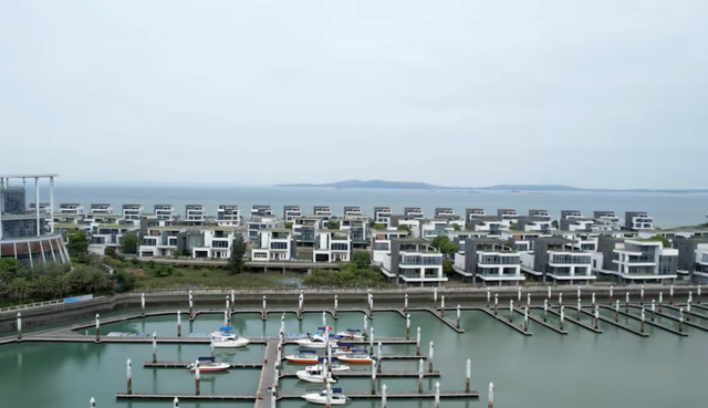 在厦门环岛路的香山避风坞,有一片寂静的海上建筑群。远远看去,是一排排外观已成型却毫无人气的别墅,杂草从庭院一直蔓延至台阶,旁边还停靠着零星几艘旧游艇,像是被时光遗弃的摆设。