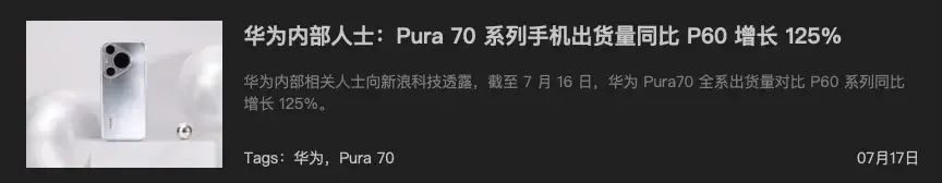 有人可能会说,是不是 Pura 70 定价太高卖不动了?然而事实并非如此。去年的 P60 因芯片问题出货量不尽人意,而 Pura 70 系列目前累计出货量对比 P60 系列同比增长 125%。若以 P60 系列 400 万的出货量计算,Pura 70 系列目前销量至少 500 万。这成绩虽在华为内部或许不如预期,但放在友商身上,那可是望尘莫及。