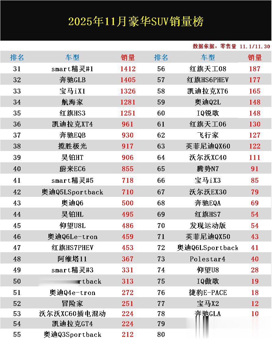 此外、自榜单30名以后,各车型销量均不足1500辆,竞争十分激烈。其中奔驰GLB、航海家、红旗HS3销量勉强破千。揽胜极光排名第38,蔚来EC6、奥迪Q6、仰望U8L、阿维塔11、本月销量均在300-800辆区间。冒险家、凯迪拉克CT4、红旗天工08、奥迪Q2L表现不佳。腾势N7排名第65,红旗HS7、发现运动、宝马X2、奔驰GLA等,本月都以2位数的销量垫底了!