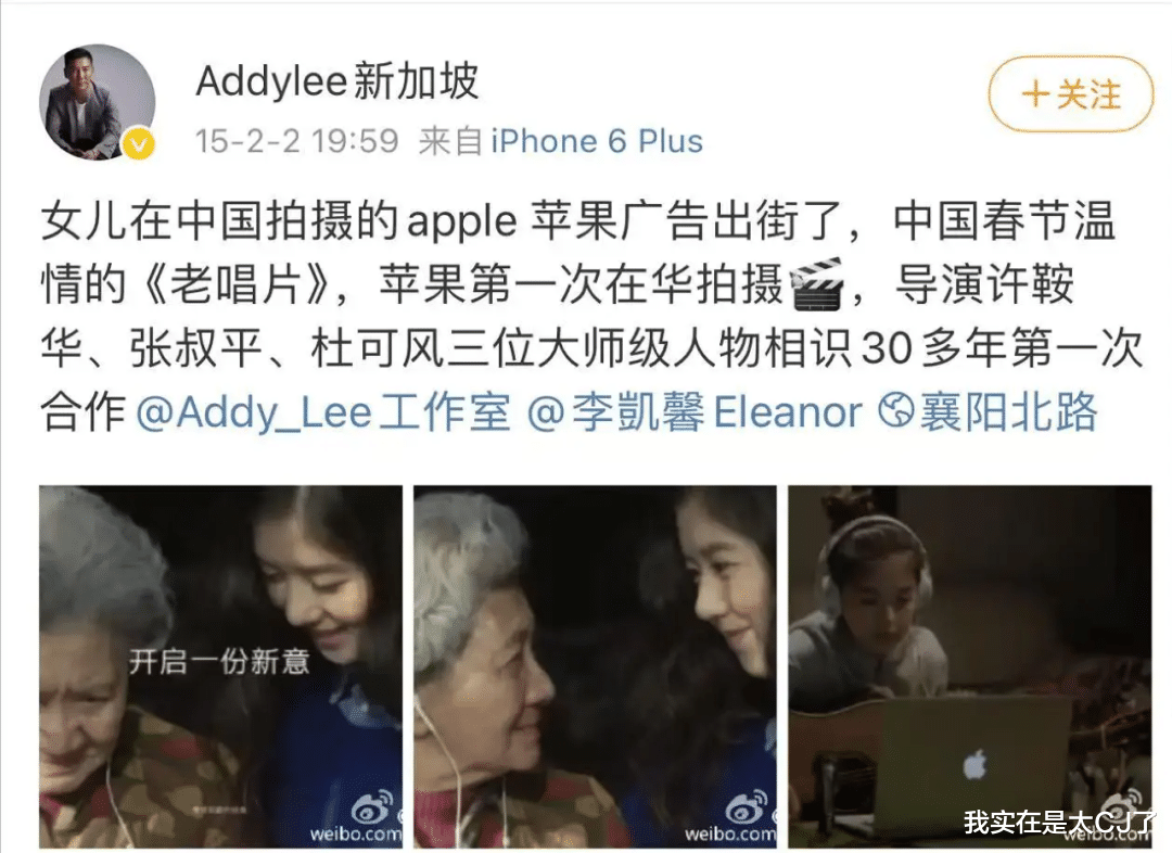 相较于她的外形(可爱邻家但没有不可替代性)、能力(演技唱腔或者“创作力”都只能说是胜在清新)、人气(当你看到热搜开始思考李凯馨是谁就已经能说明些问题),拥有的资源那叫一个非常逆天:出道就是在许鞍华导演的苹果微电影广告片里,而且不是作为背景板参演,是推动故事发展的主角。