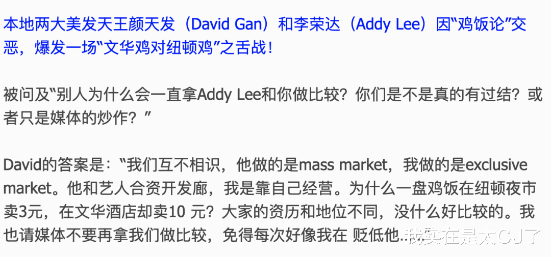 对此颜天发有过一番“鸡饭论”,说李荣达的发廊是跟艺人合资的mass market,觉得和自己做的exclusive market没有可比性。