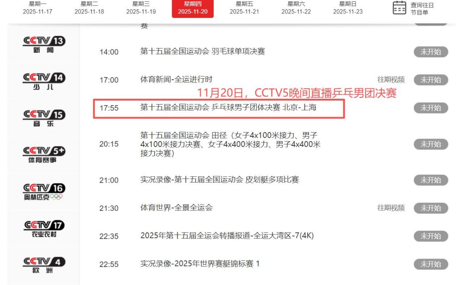 北京时间11月20日,2025年全运会乒乓球项目迎来收官之战。在已经决出九项冠军后,压轴大戏男团决赛即将在北京队与上海队之间上演“终极对决”,而铜牌争夺战同样看点十足。这场被誉为“乒乓球项目巅峰之战”的较量,将为本届全运会画上圆满句号。