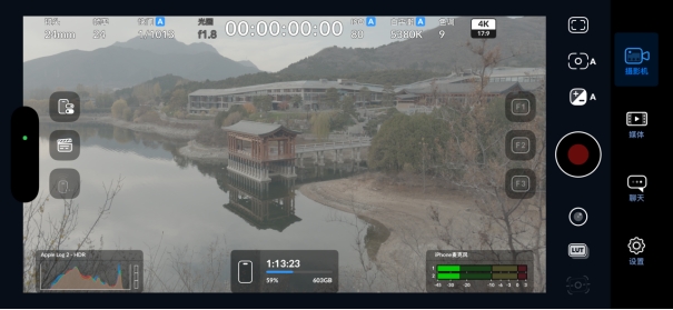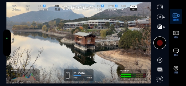 另一个App是:Blackmagic Cam。帧率、白平衡、手动曝光等等功能应有尽有。还提供直方图、音频表、斑马纹等专业功能。当然同样支持拍摄log视频,拍摄完成后用户可以通过官方自带的LUT进行色彩还原,网上也有很多LUT资源,大家按需选择。