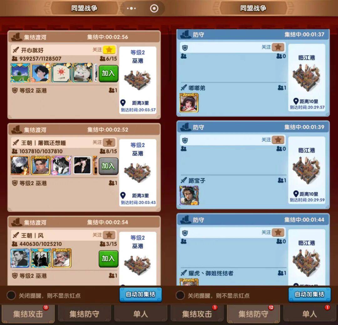 水战中双方仅能选择渡河集结,集结时间固定三分钟,无法发起单人进攻,每人仅能发起和参与1次集结。发起集结时可在东、西两条渡河路线进行选择,选择的同时可以看到我方同盟在两条路线上已有集结队伍的数量,此时应防止我方集结数量泄露。