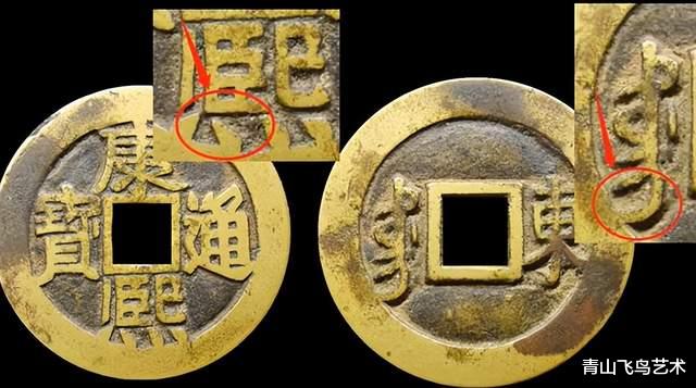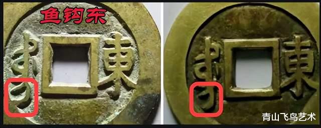 在我们康熙通宝中有一种康熙满汉鱼钩东版本的钱币,这种钱币就有个特点,背面满文东字不仅要像鱼钩一样,而且必须链接那一撇,其次面文“熙”字下面左侧第二个点不上挑,普通版本的“熙”字都有挑的特点。背面满文东有一点点右拐。这种钱币品相的话都是大几千的样子。