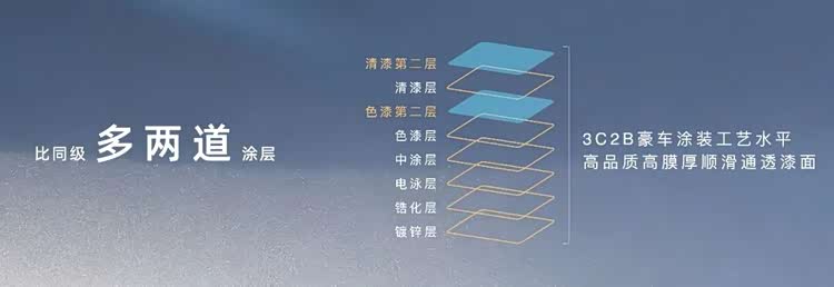 为了让新车更好看、更高级,设计师在车漆工艺上花了很大功夫。埃安i60比同级多了一道色漆层和一道清漆层,达到了豪车级别的“3C2B车漆喷涂工艺”水平,让漆面显得更精致,同时也更耐磨。两道清漆层达到双倍抗氧化、抗紫外线的效果,防腐性能更优异,让车漆经久不褪色。