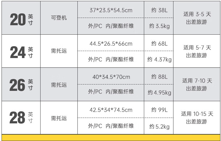行李箱的尺寸一般在 16~ 32 寸,个人最推荐的尺寸是20寸,也就是我们常说的【登机箱】。大小适中,搭配上背包可以满足大部分的出行场景,而且无论飞机还是火车,登机箱大部分都可以作为随身行李带上飞机,坐火车的时候也可以放在座位上的行李区,可以因为托运,或单独放置带来的等待时间或安全问题。都非常的方便。