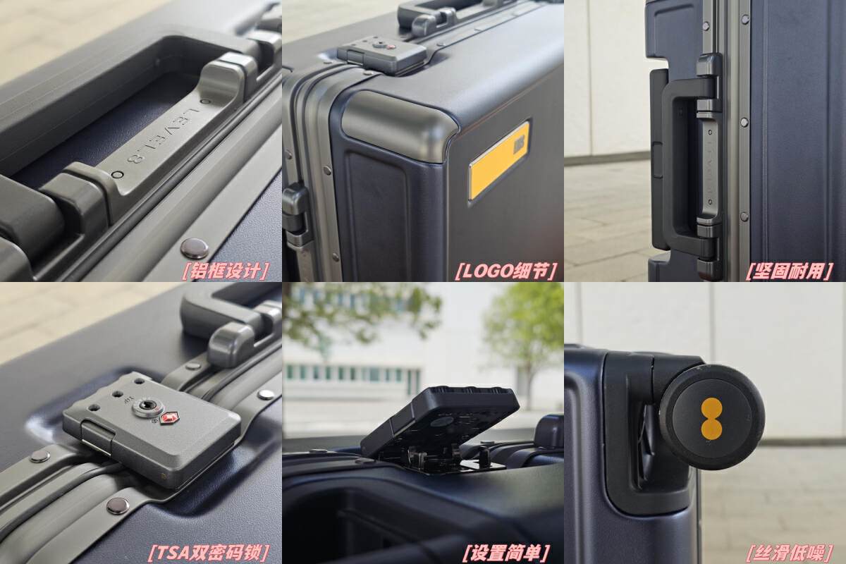 从设计角度:铝框的加入提升了行李箱整体的质感,会显得更有档次。同时雾面磨砂质感的PC材质与同色系的铝框搭配起来形成了独特的设计风格。
