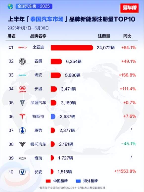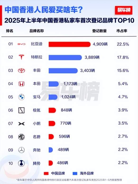在竞争态势严峻的亚太市场,比亚迪同样取得亮眼成绩。作为长期被日系品牌盘踞的市场,比亚迪在泰国持续书写着自己的“泰国现象”,双双包揽新能源汽车和纯电动车销冠,纯电市场份额甚至达到了35%。除此以外,在俗称“亚洲最贵”的新加坡市场,比亚迪已完成全品牌的“统治”,成为2025上半年乘用车销量冠军。与新加坡市场类似的还有香港市场,比亚迪凭借着海狮07的热销,持续多月成为“香港市民最爱买”的汽车品牌,仅在今年上半年,销量已经接近5000台,增速位居市场第一。