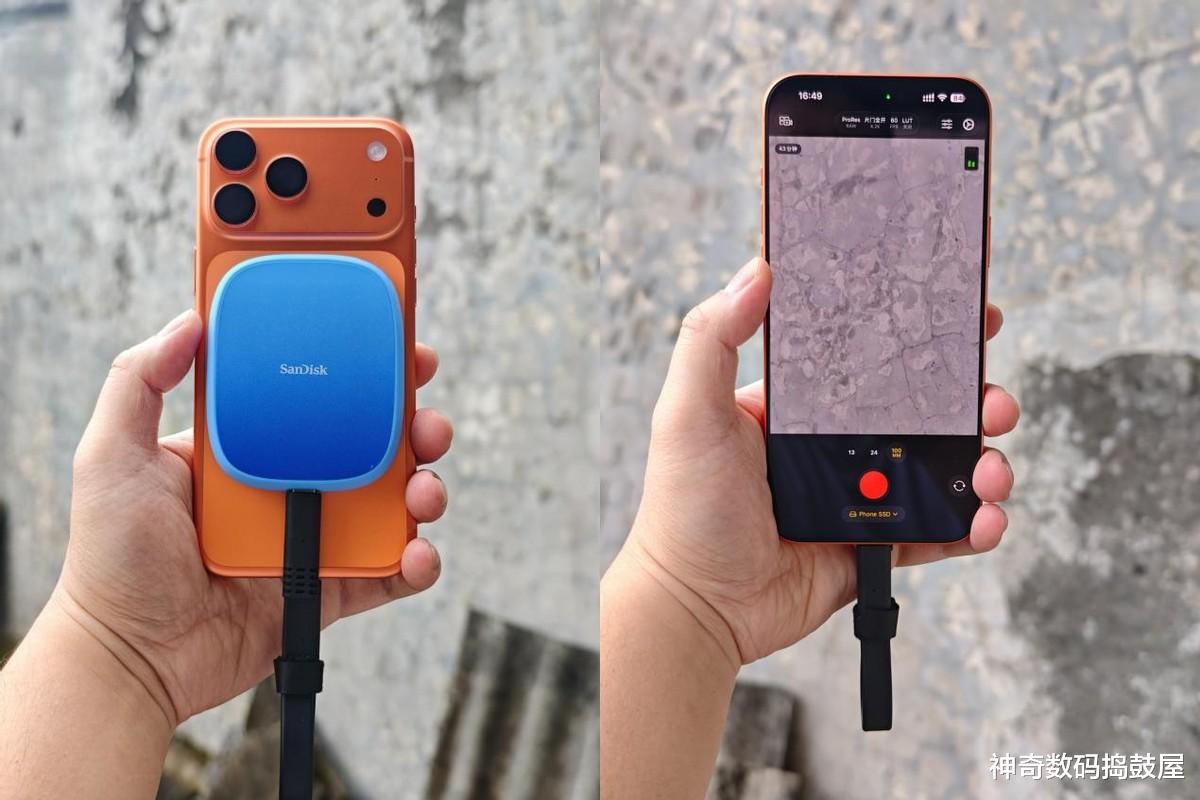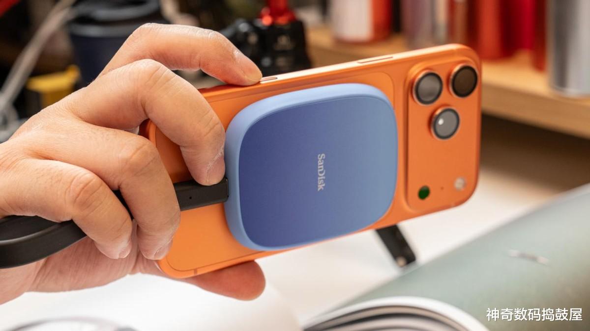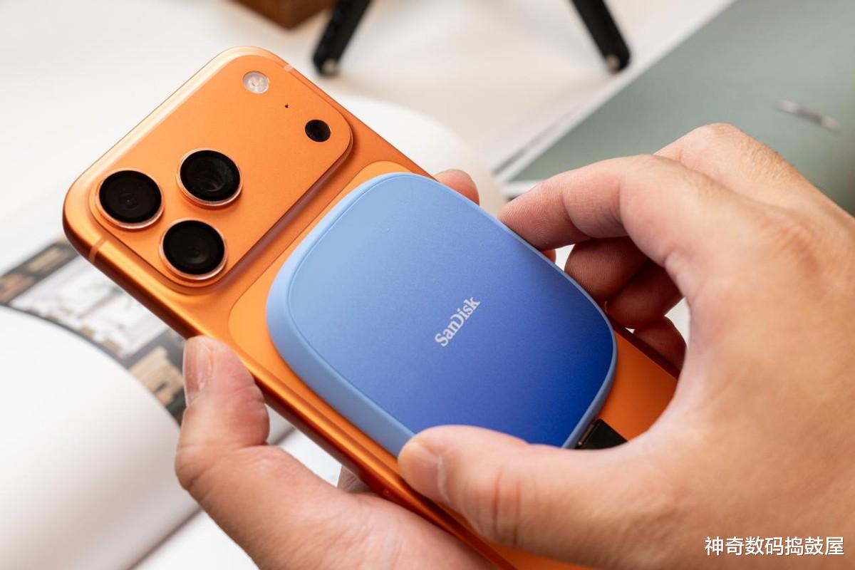 要说最大亮点肯定是这个MagSafe磁吸设计,闪迪创作者E62C往iPhone 17 Pro Max背上一吸,咔嗒一声就位,手感特踏实。磁吸力度调得刚刚好,硬盘和机身吸得特别稳当不说,关键还不挡摄像头,竖着横着拍摄都不影响构图。