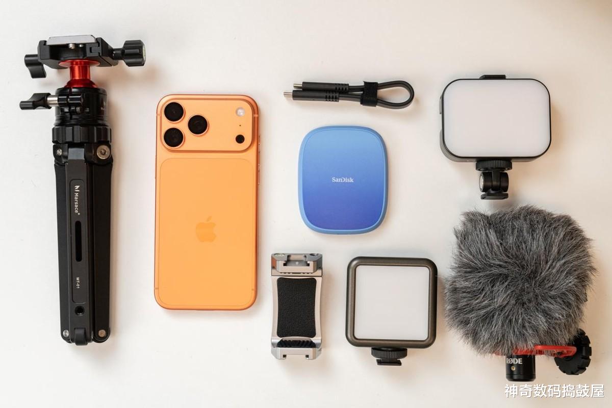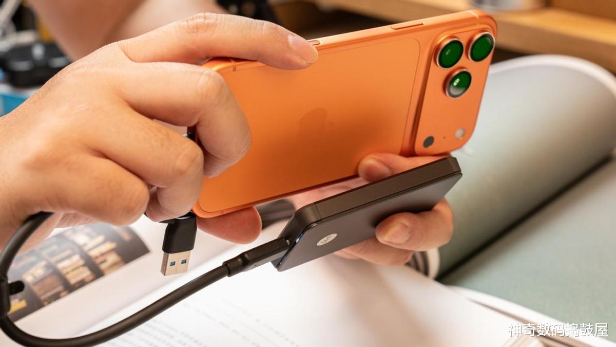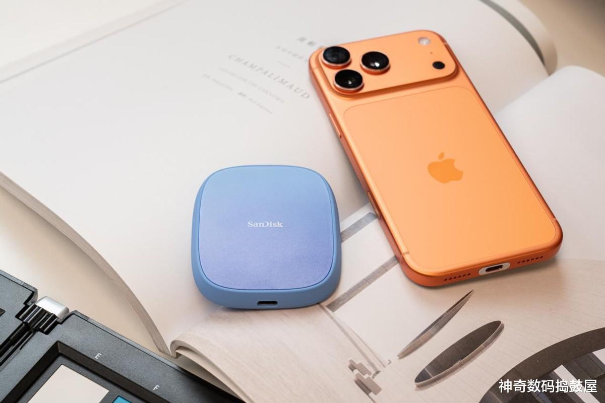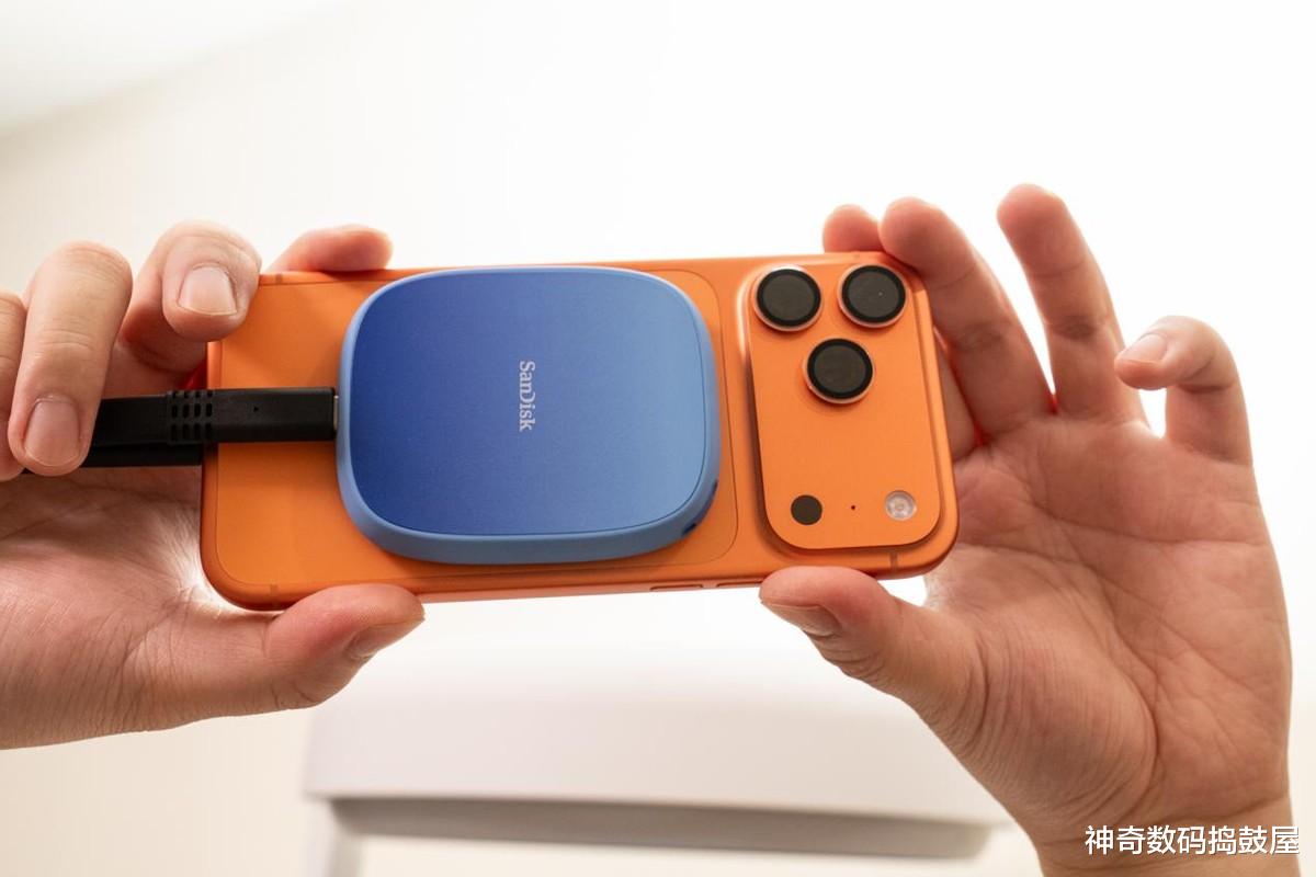 要说最大亮点肯定是这个MagSafe磁吸设计,闪迪创作者E62C往iPhone 17 Pro Max背上一吸,咔嗒一声就位,手感特踏实。磁吸力度调得刚刚好,硬盘和机身吸得特别稳当不说,关键还不挡摄像头,竖着横着拍摄都不影响构图。
