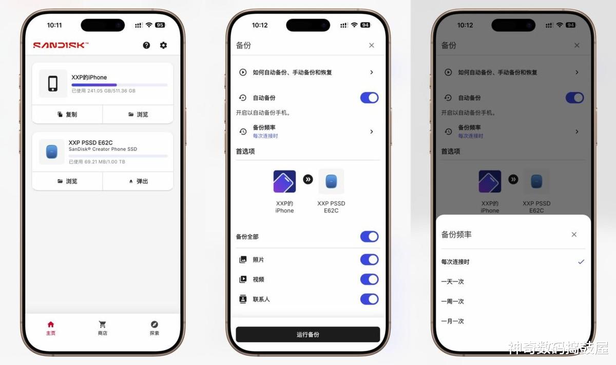 拯救健忘症的备份神器:闪迪存储地带应用程序(Memory Zone APP)手机端下载闪迪存储地带应用程序(Memory Zone APP),当插入闪迪创作者E62C时,就可以实现无缝备份和浏览管理数据文件。特别是自动备份功能非常强大,按需求调频次,无论是实时每次连接备份还是定时任务(每日1次、每周1次、每月1次),插上硬盘点开App直接进入托管模式,备份全程纯自动,连手指都不用抬。