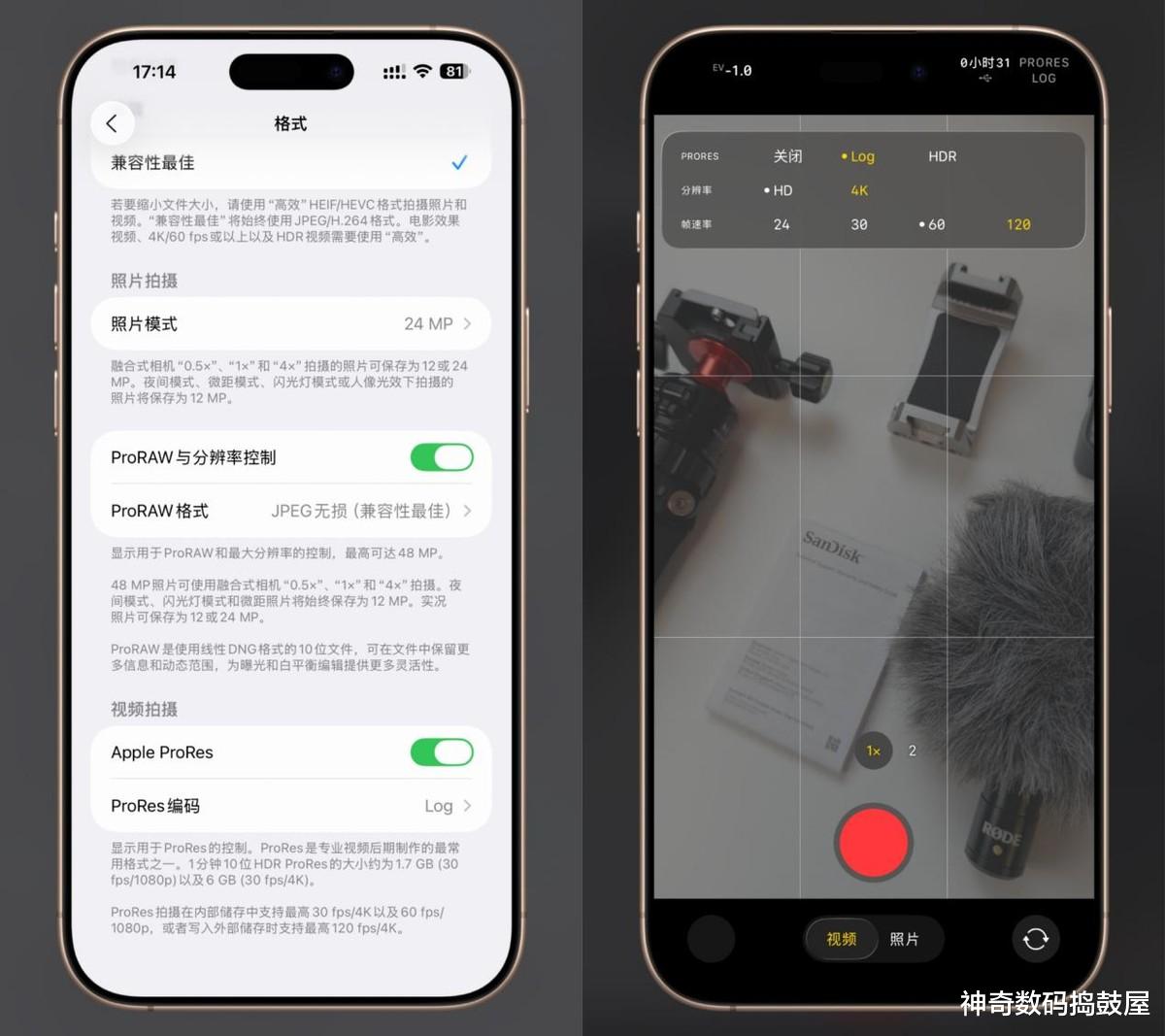 iPhone 17 Pro系列想用ProRes格式拍视频其实很简单,先在iPhone设置里找到「相机」-「格式」里的视频拍摄选项,把Apple ProRes开关打开。这时候接上移动硬盘,直接用自带的相机App就能录制4K 60帧甚至120帧的ProRes视频了,完全不需要第三方软件。