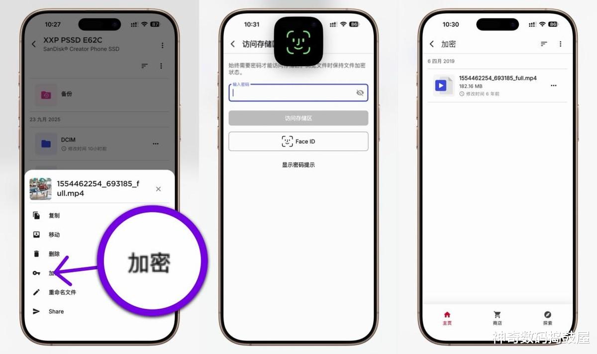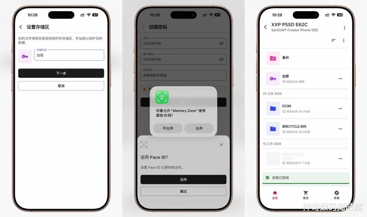 除了备份功能外,闪迪存储地带应用程序(Memory Zone APP)还支持加密功能,可以更好地保护隐私,让数据更安全。在App中创建加密存储区,可以使用密码或者Face ID解锁,把需要加密的文件进行加密即可,非常的便捷。