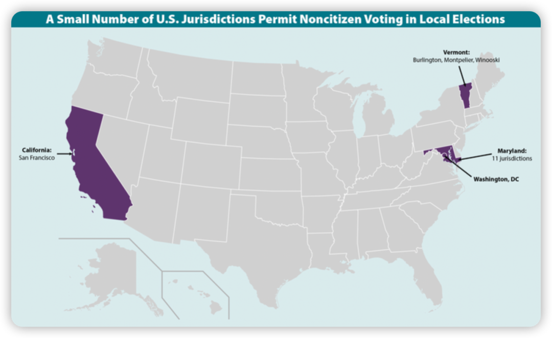 有读者可能会询问:难道非公民可以参与某些选举?德州发起禁止非公民投票是否多此一举?虽然全美禁止非公民参与到联邦级的选举投票中,但地方性选举则不然。上图蓝色州,非公民可以对地方性选举进行投票,比如加利福尼亚州的奥克兰和旧金山市,华盛顿特区,马里兰州和佛蒙特州的某些城镇,例如:如果非公民的孩子在公立学校就读,那么非公民可以对校董事会等竞选进行投票。