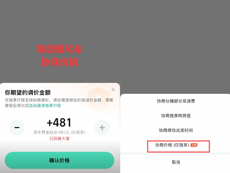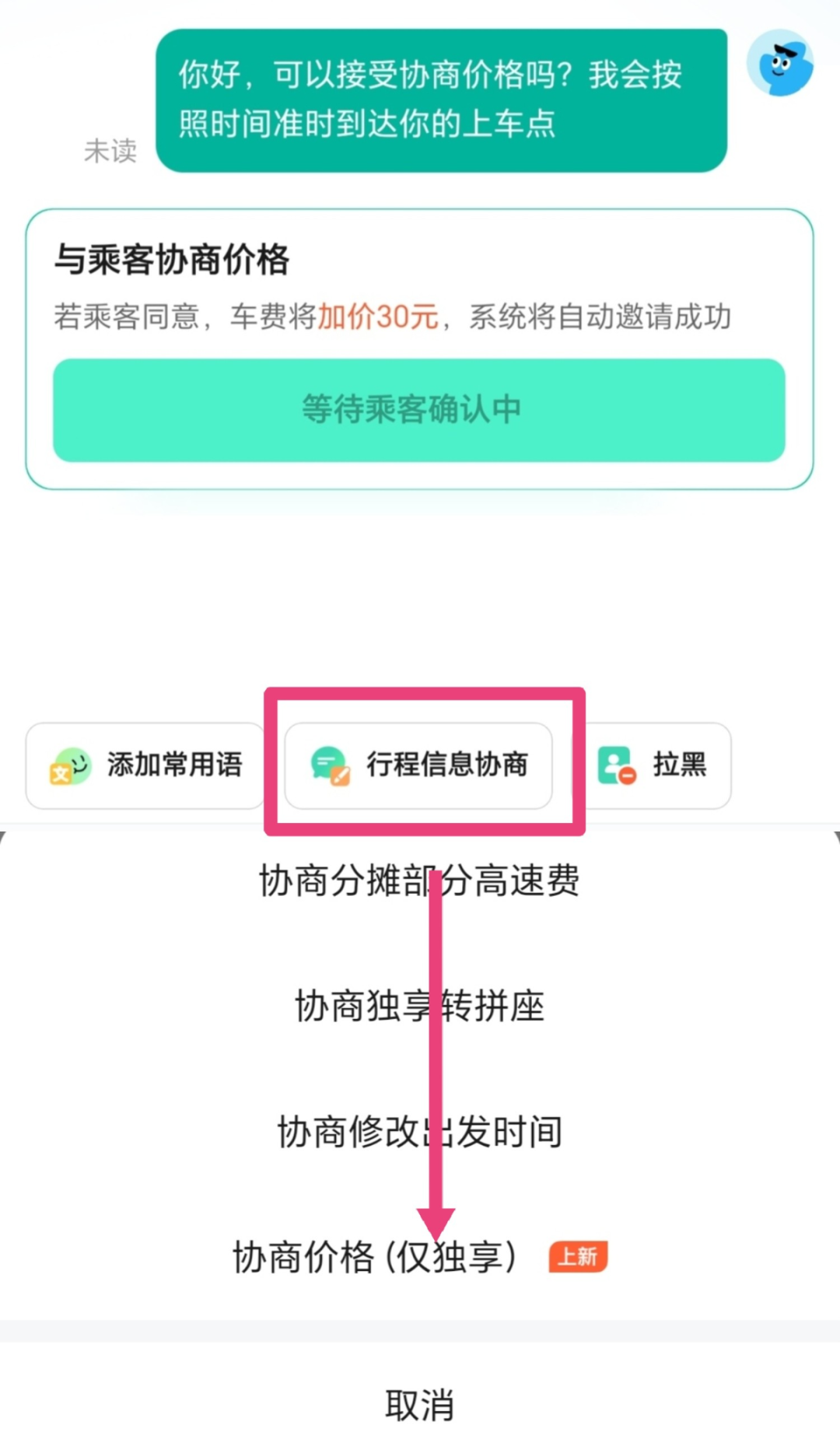 车主可以自主加价或者减价乘客接受之后将自动邀请独享行程👇