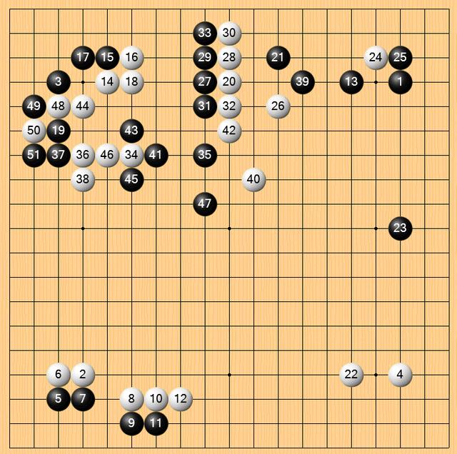 本局,卞相壹九段执黑先行。白50断,成为本局的分水岭。黑51拐吃,黑棋再也没有任何机会。