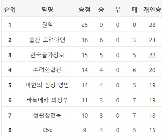 本场比赛取胜后,韩国物价情报队以15分排名联赛第3名。而正官庄队,以10分排名联赛第7位。KB联赛一共只有8家俱乐部,正官庄队仅仅排在KIXX队的前面。