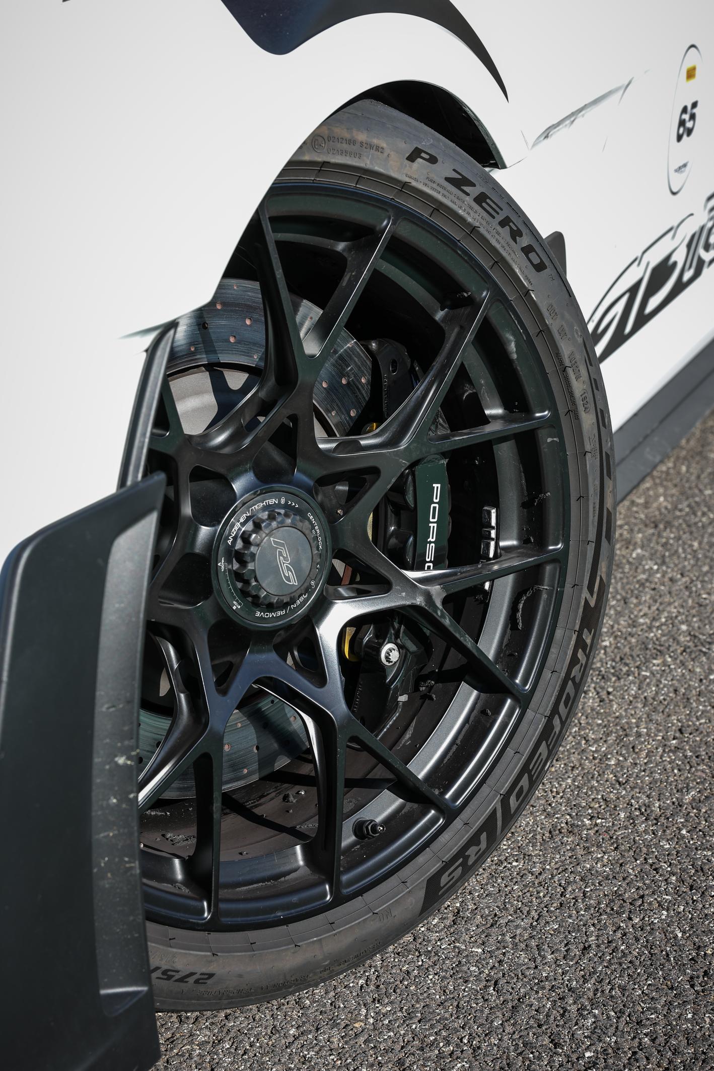 保时捷911 GT3 RS在轮胎开发过程中面临了多项技术挑战。轮胎既要增强车辆在公路上的驾驶特性,又要借助车辆极致的空气动力学和轻量化设计,提供接近于赛车的性能表现。倍耐力为此专门打造的两款全新轮胎满足了这些相对矛盾的需求,前轮规格均为275/35R20,后轮规格均为335/30R21。P Zero Trofeo RS是一款专为展现赛道高性能而打造的半热熔轮胎,而P Zero Corsa轮胎更偏向于公路驾驶。搭载于保时捷911 GT3 RS的P Zero Trofeo RS轮胎具有比P Zero Trofeo R轮胎更广的工作范围,这主要得益于倍耐力在世界顶级赛车运动中积累的经验。该轮胎凭借其快速的预热能力提供瞬时抓地力,使驾驶员在赛道上从第一圈就能挑战极限。由于磨损率降低,即使在最严苛的驾驶过程中,轮胎也能承受压力。这要归功于其强化的内部结构,能在巨大的空气动力学荷载下提供支撑,通过虚拟设计技术优化的胎面设计,以及采用了拉力赛沥青路面轮胎配方的专用材料。P Zero Trofeo RS轮胎兼具在干燥路面的高性能表现,及驾驶在潮湿路面的安全性。