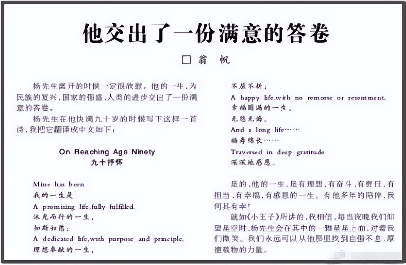 10月19日,杨振宁先生去世的第二天,妻子翁帆通过报纸刊登了一则文章,悼念亡夫。